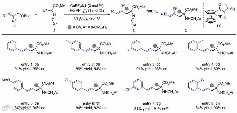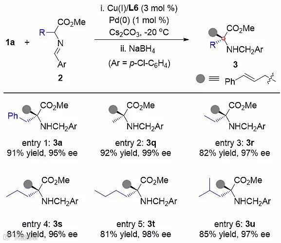 在筛选了一系列反应条件后,作者使用Pd(PPh3)4和CuBF4/(S,Sp)-iPr-Phosferrox作为协同催化剂、Cs2CO3作为碱、-20 ℃条件下以二氯甲烷作为溶剂可以得到最优的结果。在该条件下,作者对席夫碱和烯丙基碳酸酯类化合物的底物适用性进行了考察。可以看到,该反应的底物适用性非常广泛,在首先考察的肉桂醇碳酸酯中,芳香环上取代基的位置和电性对反应的结果影响较小,杂环和烷基取代的烯丙基碳酸酯也可以很好地在该催化体系下反应。此外,作者还尝试了烯丙基以及2-甲基烯丙基碳酸酯参与反应,并取得了很好的结果。