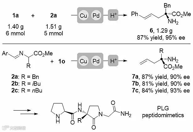 最后,作者还成功地将反应放大至克级并将该方法学应用于一系列PLG模拟肽的关键中间体合成中,首次通过不对称催化的方法实现了该类中间体的合成,由此证明作者发展的方法学具有较高的实用性。