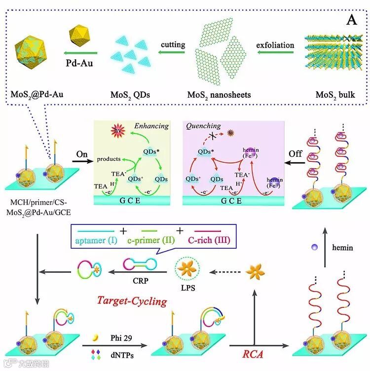 二硫化钼量子点(MoS2 QDs)是一类具有类似石墨烯独特二维结构的过渡金属二硫化物纳米材料,不仅具有发射光谱可调控、量子产率高和易功能化等优点,而且由于无重金属离子表现出良好的生物相容性,现已广泛用作催化剂、荧光探针等。迄今为止,二硫化钼量子点电致化学发光(ECL)的研究尚无报道。最近,西南大学电分析团队的袁若、卓颖教授通过化学剥离法制备得到无毒、经济的MoS2 QDs,并率先研究其ECL性能。在三乙胺(TEA)共反应试剂的存在下,他们可以观察到MoS2 QDs的强ECL信号。基于MoS2 QDs/TEA ECL体系结合适体识别驱动目标物循环同步滚环扩增(RCA)的放大策略,他们构建了免标记的“On-Off”适体传感器,实现了对内毒素的高灵敏检测。该传感器对浓度在0.1 fg•mL-1~50 ng•mL-1范围内的内毒素表现出良好的线性响应,其检测限低至0.07 fg•mL-1。实验结果表明,该新型MoS2 QDs将成为一种有竞争力的新兴ECL纳米材料类发光物质,在生物分析领域具有广阔的应用前景。这一成果近期发表在Analytical Chemistry 上。