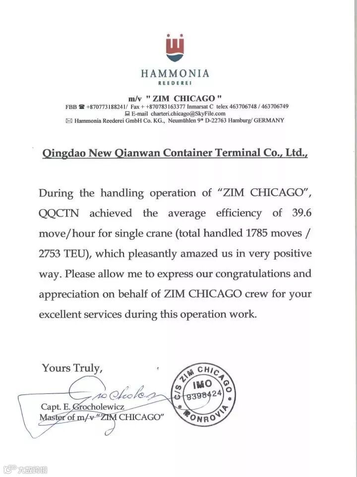 “以星芝加哥”轮船长格罗索莱维奇将写有“青岛港单机平均效率39.6move/h”的确认书郑重交给码头总经理张连钢手中,激动的说:“青岛港创造了集装箱码头行业的世界奇迹,让全世界为中国感到骄傲!”