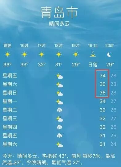 从青岛市气象台预报信息看,今起三天,我市多云间晴,北部局部短时阴有阵雨或雷阵雨,南3-4级,有轻雾,沿海短时有雾,雷雨时阵风8级,最低气温全市26~28℃,最高气温市区及沿海31℃左右,内陆地区32~36℃。
