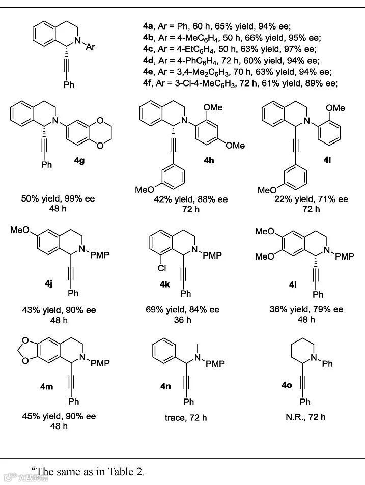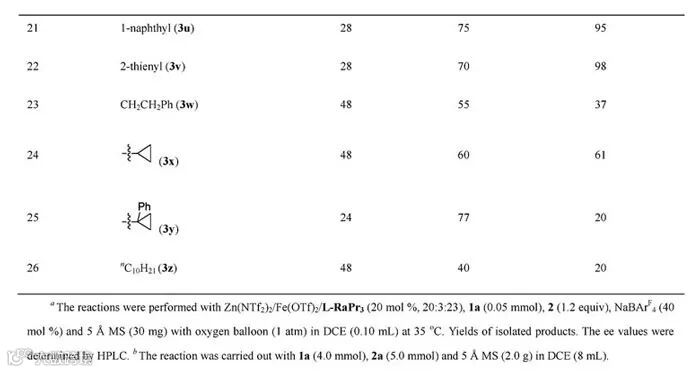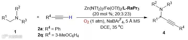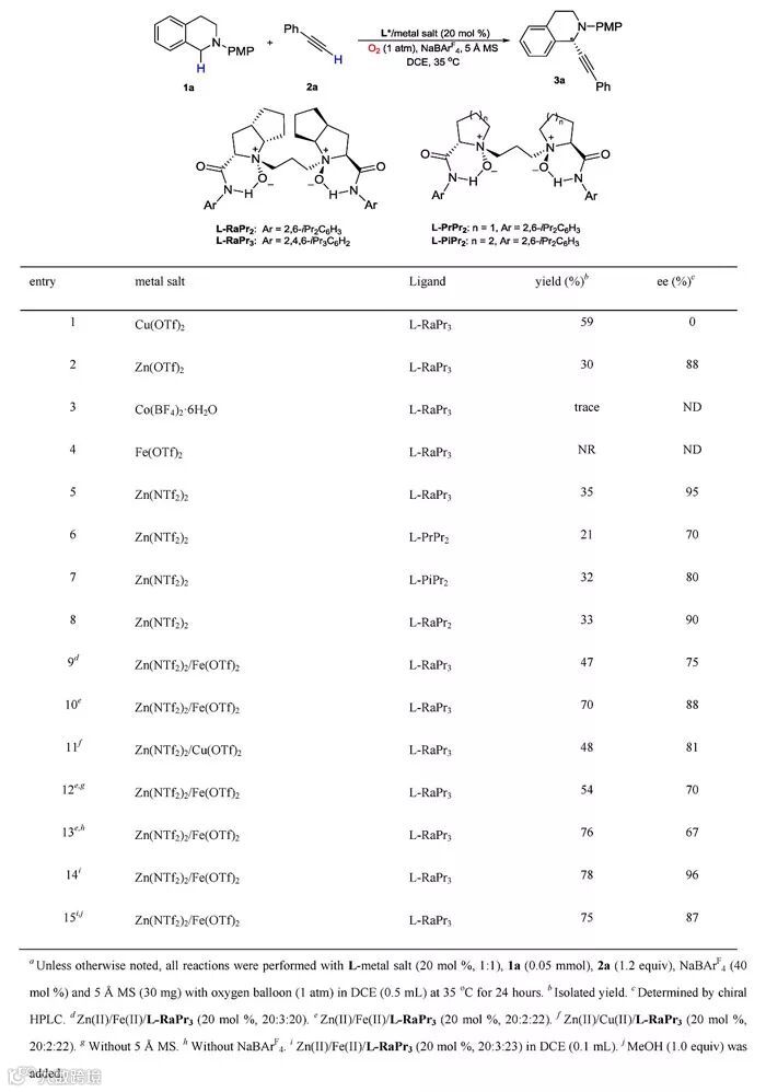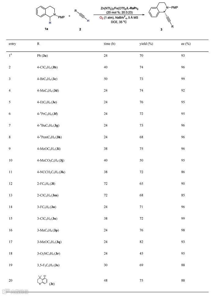 作者以N-PMP保护的四氢异喹啉1a以及苯乙炔2a作为起始原料、氧气作为氧化剂,在L-RaPr3-Zn(NTf2)2催化下,可以35%的收率和95%的对映选择性得到目标产物3a。为了解决收率问题,作者通过加入Fe(II)作为共催化剂来加速亚铵正离子中间体的形成。通过对反应条件的进一步优化,他们得到了最优反应条件:L-RaPr3-Zn(NTf2)2/Fe(OTf)2作为双金属催化剂、1,2-二氯乙烷作为溶剂、5 Å分子筛及NaBArF4作为添加剂、氧气作为氧化剂,在35 ℃下反应24 h可以得到78%的收率、96%对映选择性的偶联产物3a(Table 1)。