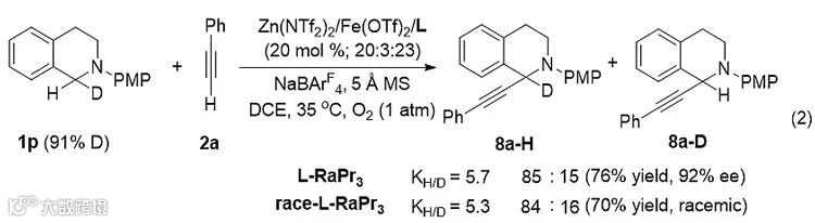 为了准确剖析反应的历程,作者进行了动力学同位素效应实验(eq 2)。外消旋的氘代底物1p分别在L-RaPr3-Zn(NTf2)2/Fe(OTf)2以及race-L-RaPr3-Zn(NTf2)2/Fe(OTf)2的催化条件下进行实验,分别得到的KH/D为5.7和5.3,证明体系的决速步骤为C-H键断裂。