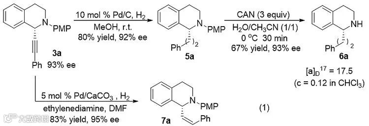 随后,作者对产物3a进行还原衍生化(eq 1)。Pd/C, H2条件下的还原产物5a可以在含水乙腈作为溶剂,加入CAN的条件下高效消除PMP保护基,得到高附加值的产物6a。通过比对6a的旋光值,作者可以得到3a的绝对构型。