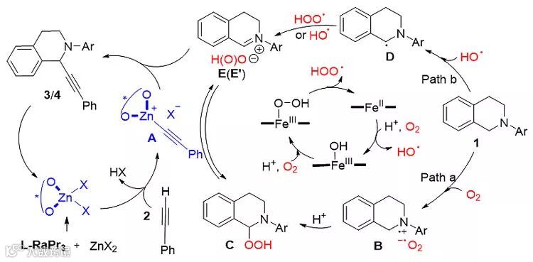 基于以上的实验结果和以往的报道,作者提出了该反应可能的机理(Scheme 2)。L-RaPr3-Zn(II)在碱的作用下与端炔形成金属炔锌中间体A。对于反应物1,作者提出了两种途径,氧气直接将1氧化得到中间体C(Path a),同时C与亚铵正离子中间体E'存在动态平衡。当1经历Fe(II)历程时(Path b),体系发生Fenton自由基历程,生成Fe(III)物种及HO•自由基,后者攫取1的H•自由基得到中间体D,与此同时,Fe(III)OOH发生均裂得到HOO•自由基,促进中间体E的生成。最后,在手性L-RaPr3-Zn(II)的调控下,反应得到不对称炔基化产物3,同时释放催化剂。