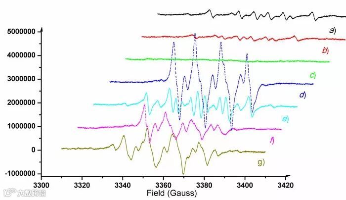 Figure 1. The electroparamagnetic resonance (EPR) spectra (X band, 9.43 GHz, rt. in oxygen-saturated DCE). (a) Zn(NTf2)2/DMPO; (b) 1a/DMPO; (c) DMPO; (d) 1a/Zn(NTf2)2/DMPO; (e) 1a/Fe(OTf)2/DMPO; (f) 1a/Zn(NTf2)2/Fe(OTf)2/DMPO; (g) 1a/Zn(NTf2)2/DMPO in the dark. The concentration of each component is as follows: Zn(NTf2)2 (0.02 mol/L), DMPO (1.33 mol/L), Fe(OTf)2 (0.003 mol/L), 1a (0.1 mol/L).