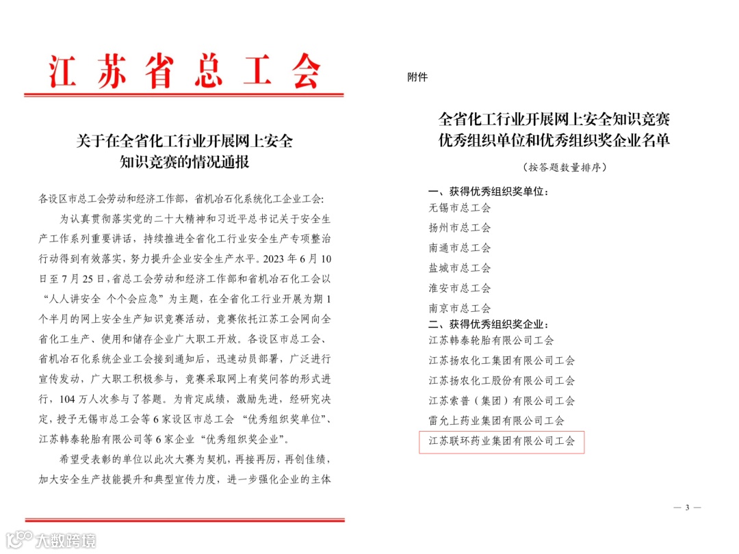 近日,省总工会劳动和经济工作部和省机冶石化工会发布《关于在全省化工行业开展网上安全知识竞赛的情况通报》。本次竞赛活动共在全省范围内评选出“优秀组织奖单位”6家、“优秀组织奖企业”6家,联环集团工会获评“优秀组织奖企业”。