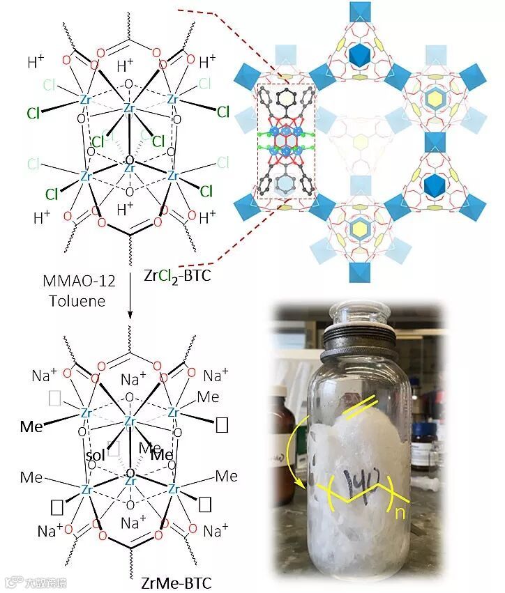 图一. ZrCl2-BTC通过与甲基铝试剂反应转化为ZrMe-BTC MOF用于乙烯的聚合反应