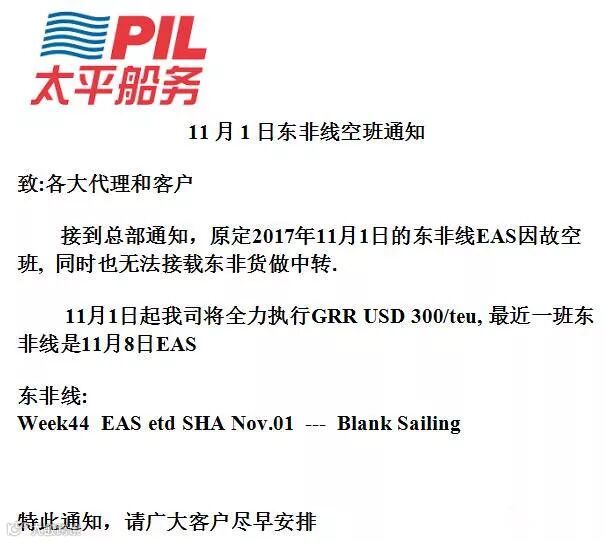 原定于2017年11月1日的东非线EAS因故空班,同时也无法接载东非货做中转。11月1日起,东非线将全力执行GRR USD 300/teu,最近一班是11月8日EAS。