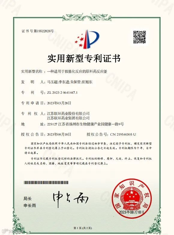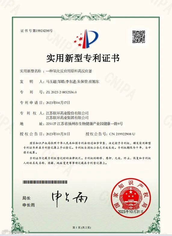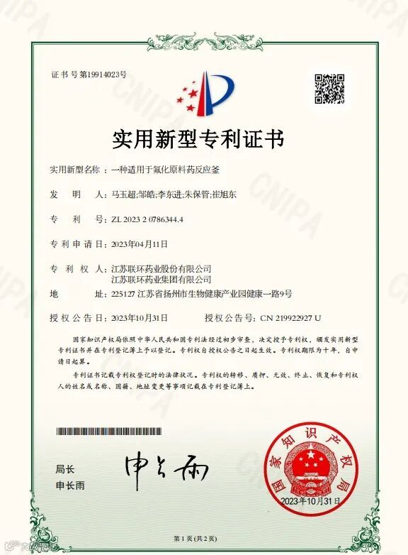 近日,从国家知识产权局传来喜讯,联环股份申报的“一种适用于烷基化反应的原料药反应釜”“一种适用于氟化原料药反应釜”“一种氧化反应用原料药反应釜”和“一种适用于胺基化反应的原料药反应釜”获实用新型专利授权。