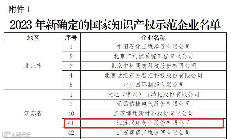 11月29日,国家知识产权局公布了2023年度国家知识产权示范企业和优势企业评定结果,江苏联环药业股份有限公司顺利跻身“国家知识产权示范企业”。