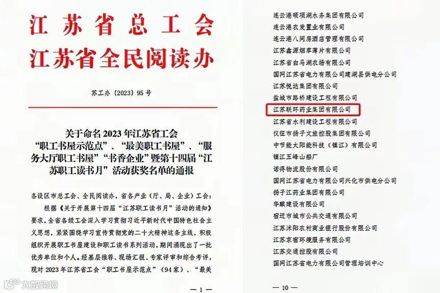 12月18日,江苏省总工会、江苏省全民阅读办联合发布《关于命名2023年江苏省工会“职工书屋示范点”“最美职工书屋”“服务大厅职工书屋”“书香企业”暨第十四届“江苏职工读书月”活动获奖名单的通报》,经上级工会推荐、集团工会现场汇报、省总专家评审和综合考评,联环集团被评为2023年江苏省工会“书香企业”。
