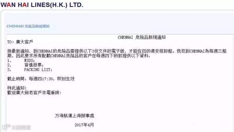 接到WHL(万海)船公司最新通知:到CHENNAI(印度.钦奈)的危险品必须提供MSDS、货值发票以及PACKING LIST三份文件的电子版,才能在目的港安排卸船。