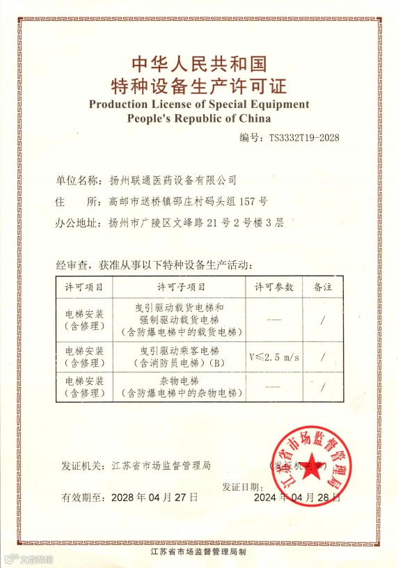 近日,扬州联通医药设备有限公司顺利通过江苏省市场监督管理局各项审核,成功取得电梯安装(含修理)许可证。