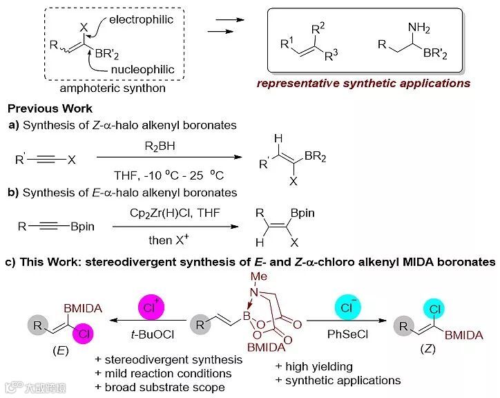 最近,中山大学药学院的王洪根教授课题组在已有研究的基础上(Angew. Chem. Int. Ed., 2016, 55, 10069),发展了一种高立体选择性合成α-氯代烯基硼酸酯的方法。作者以烯基(N-甲基亚胺二乙酸)硼酸酯(N-甲基亚胺二乙酸:MIDA)作为底物,分别与氯代试剂PhSeCl和t-BuOCl反应,以较高的立体选择性发散式地得到了Z 式和E 式构型的α-氯代烯基硼酸酯。