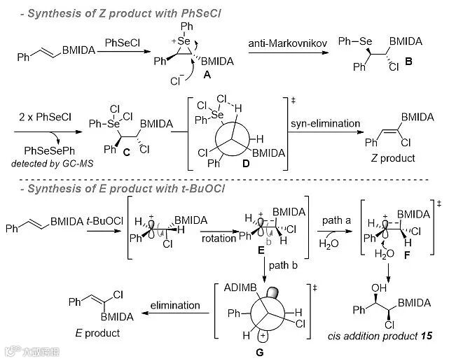 机理实验中,作者发现与频哪醇硼酸酯相比,MIDA硼酸酯基团的引入不仅增加了底物的反应活性,而且减少了脱硼氯代副产物的产生。另外,通过Z构型底物参与反应,作者发现两个氯代反应均为立体专一性的反应。对于Z式α-氯代烯基硼酸酯的形成,作者认为底物首先与PhSeCl反应形成硒鎓离子A,氯负离子随后对其进行反马氏亲核进攻得到B,最后发生顺式消除。而对于E 式α-氯代烯基硼酸酯的形成,作者推测的机理如下:烯基与氯正离子首先发生反应,该过程同时伴随着C-C σ键的旋转,形成C-B键超共轭稳定的苄基正离子E,C-C σ键进一步小角度旋转,通过过渡态G发生β-H消除得到产物。中间体E还可以被体系中的水进攻,得到顺式氯羟基化的产物,该产物是反应观察得到的副产物。