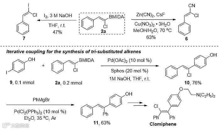 此外,为了证明该反应的实用性,作者对得到的产物进行了一系列的衍生化实验。例如,产物中的MIDA硼酸酯可以转化成碘、氰基,也可以发生迭代偶联反应,生成三取代的烯烃。作者还将该方法应用到抗雌激素药物克罗米芬的合成过程中。