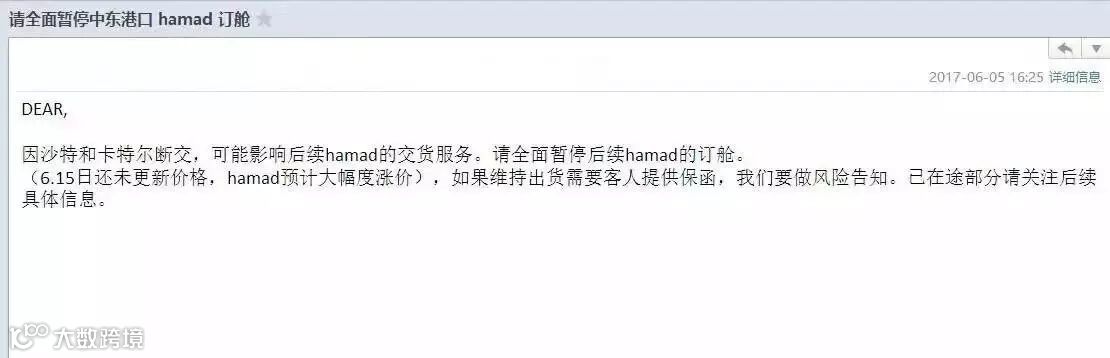 某船东已发通知全面暂停后续卡塔尔HAMAD订舱