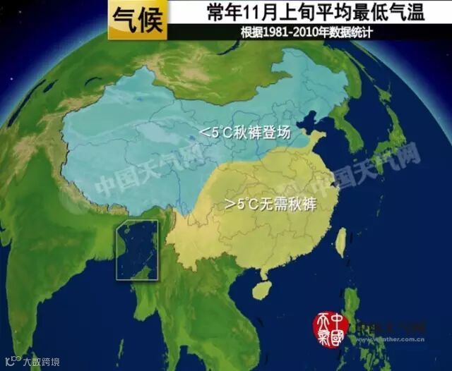 秋裤君每年秋冬季节出来刷存在感,也刷出一定的节奏感了。根据1981-2010年的气候统计,一般到了10月下旬,我国北方大部地区包括西北大部、东北地区以及华北地区,平均最低气温都低于5℃,这个时节最低气温基本稳定在5℃以下,秋裤党开始大范围登场。