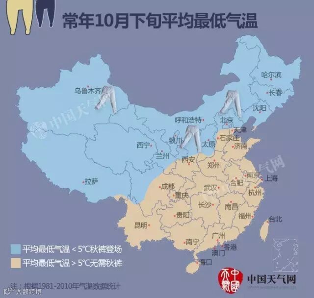 小编以日最低气温跌至5℃以下作为穿秋裤的标准,统计后发现,秋裤已经在我国北方大范围登场了!
