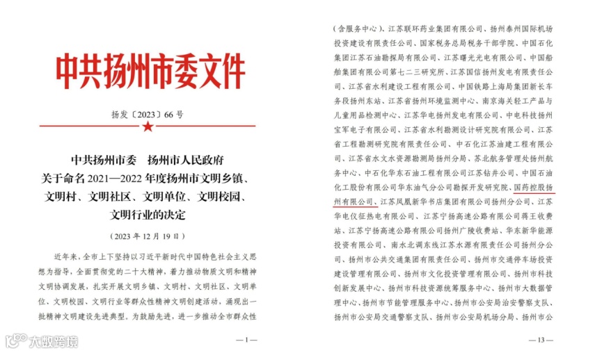 近日,中共扬州市委、扬州市人民政府印发《关于命名2021—2022年度扬州市文明乡镇、文明村、文明社区、文明单位、文明校园、文明行业的决定》,国药控股扬州有限公司再次获评“扬州市文明单位”荣誉称号。