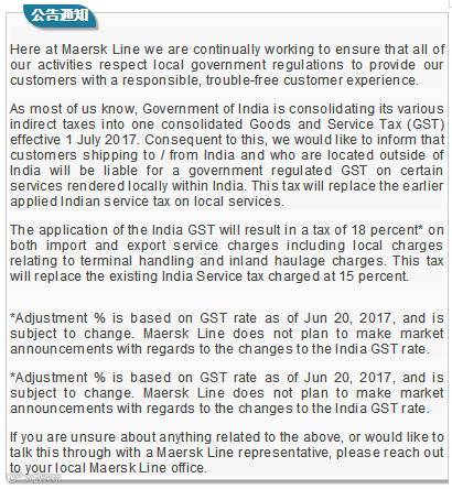 近日,马士基在其官网上就关于印度进出口服务税发布了更新公告,从7月1日起,印度将就进出口印度的货物收取货物和服务税(Goods and Service Tax (GST)),有相关出口计划的货代和外贸企业需留意。
