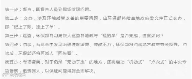 而李干杰部长所谓的“五步法”,即督查、交办、巡查、约谈、专项督察的一套“组合拳”。