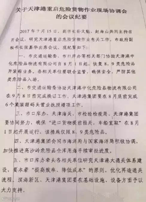 日前,天津市副市长孙文魁,赵海山共同主持召开会议,研究天津港重启危险品货物作业有关工作。天津市交通运输委、天津市口岸办等相关部门协助天津中化危险品物流有限公司自8月1日起,恢复8,9类危险品开装箱业务。严防其他类危险品如入场。
