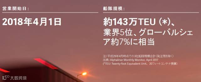 日本三大船公司本川崎汽船(K Line)、商船三井(MOL)及日本邮船(NYK)于2016年10月31日宣布将合并集装箱业务,拟于2017年7月1日成立合资公司,2018年4月1日起正式运营。在合资公司中,商船三井及川崎汽船各占31%的股份,日本邮船占38%的股份,运力可达140万TEU,全球班轮运力预计排名第六,约占全球7%的市场份额,主要负责包括日本以外的码头运营在内的集装箱运输业务。