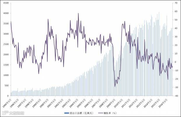 由于2015年和2016年人民币累计出现了两位数贬值幅度,结合外贸港口货运量仍然在小幅增长的现实,说明以人民币计价进出口贸易额峰值还没有出现或者即将出现,这是2017年需要观察趋势之一。但是作为进出口贸易继续拉动中国经济内部发展动力接近阶段性的枯竭,已是不得不面对的客观事实。