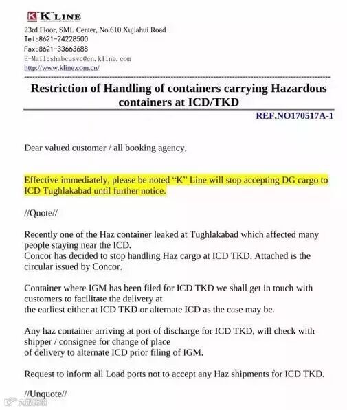 从即日起,KLINE停止接受去往ICD TUGLAKABAD的危险品订舱,直到日后另行通知。