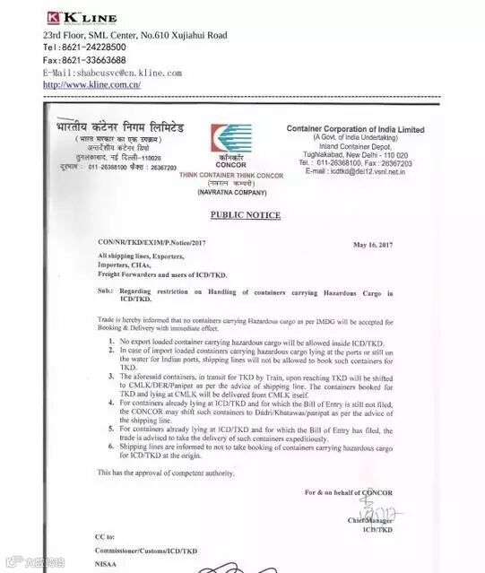 预计接下来可能会有更多的船公司停接发往新德里的危险品,请广大的货主货代们务必注意。KLINE具体通知公告如下: