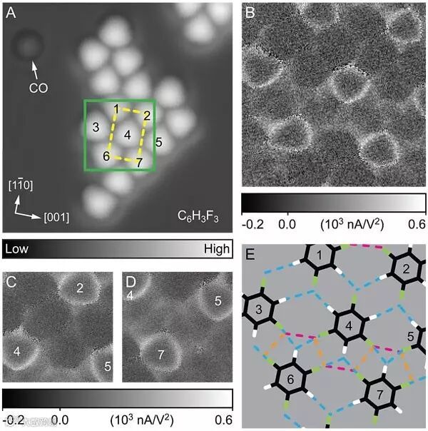 最后作者还运用itProbe技术测量了1,3,5-三氟苯(C6H3F3)在Ag(110) 表面的二维自组装岛状结构。C6H3F3分子间通过V字形分叉的C-H∙∙∙F相互作用而结合在一起,形成与三维C6H3F3晶体中分子层内部相同的分子排列结构。图5C展示的是一个C-F与两个C-H相互作用,图5D展示的是两个C-F与以个C-H相互作用的情形。