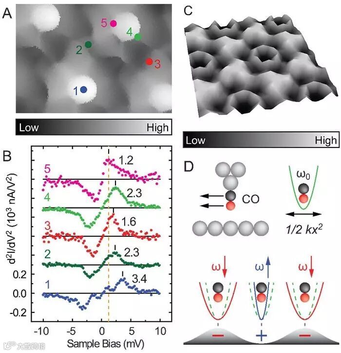 随后作者对itProbe 的工作机制做了一个定性的解释(图3)。在实验中可以通过控制扫描探针和表面的距离,把一个吸附在Ag(110)表面的CO分子转移到针尖上。CO在针尖上的振动可以通过非弹性电子隧穿能谱(IETS)来检测。其中能量最低的受阻平动(HT)模式对外界环境的影响非常敏感。从图3A可以看到,当CO针尖处于在C6F6分子岛内不同位置上方时,它的HT振动能量会有不同的相应。比如从苯环中心的3.4 meV红移到了苯环上的1.2 meV(图3B)。如图3C所示,针尖上的CO分子与表面的C6F6分子相互作用而形成了一个势能曲面(PES),正是由于PES的空间分布造成了CO分子振动能量的移动。CO的HT振动看成是一个简谐振子(图3D),在PES峰和脊的位置上的曲率是负的,这就使得CO振动的整体曲率下降,从而造成了能量的红移。相反地,在能谷的位置曲率是正的,就使得振动能量相应的蓝移。所以通过选取一个比背景振动能量更低的能量位置(1.2 meV),记录该能量下振动能谱的强度随针尖在空间扫描而形成的图像,就得到了关于PES峰和脊的空间分布。而这些峰和脊的位置恰好对应着由于化学键而引起的高电子密度区域。从而itProbe图像可以和化学键在空间分布紧密地联系起来。