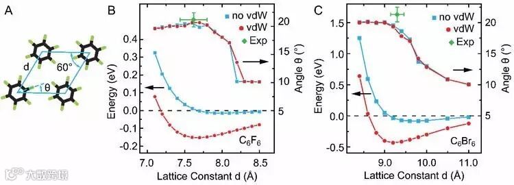 图4. 不包含衬底的二维C6F6 和C6Br6 六角格子的DFT 计算。图片来源:Science
