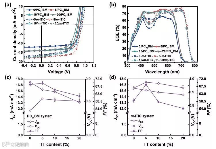 图3. a)基于PC71BM或者m-ITIC的电池效率;b)对应的EQE曲线;c)基于PC71BM的电池中随着TT成分改变不同器件参数的变化;d)基于m-ITIC的电池中随着TT成分改变不同器件参数的变化。图片来源:Adv. Energy Mater.