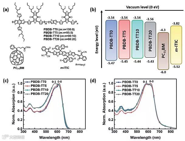 图2. a)所用材料的化学结构;b)不同材料的化学能级;c)四种聚合物的溶液吸收谱图;d)四种聚合物的薄膜吸收谱图。图片来源:Adv. Energy Mater.