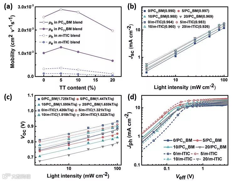 图4. a)随着TT含量变化空穴及电子迁移率的变化;b)随着光强变化短路电流的变化;c)随着光强变化开路电压的变化;d)Jph对有效电压的变化。图片来源:Adv. Energy Mater.