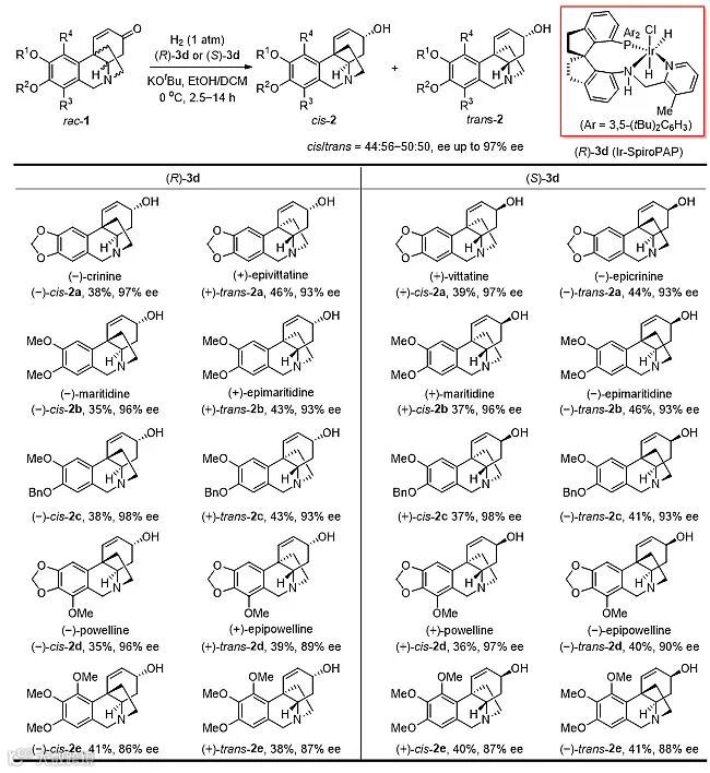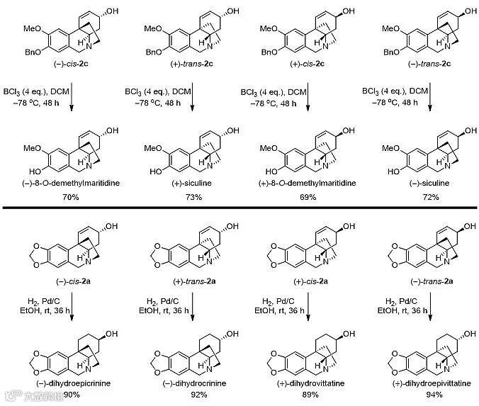 从不对称催化氢化所得到的文殊兰型生物碱及其类似物出发,经过三溴化硼脱O-苄基保护、钯碳催化氢化还原双键等转化即可合成文殊兰型生物碱 (-)-siculine、(+)-siculine、(-)-8-O-demethylmaritidine、(+)-8-O-demethylmaritidine和氢化文殊兰生物碱(+)-dihydrovittatine、(+)-dihydroepivittatine、(-)-dihydrocrinine、(-)-dihydroepicrinine等(图3)。