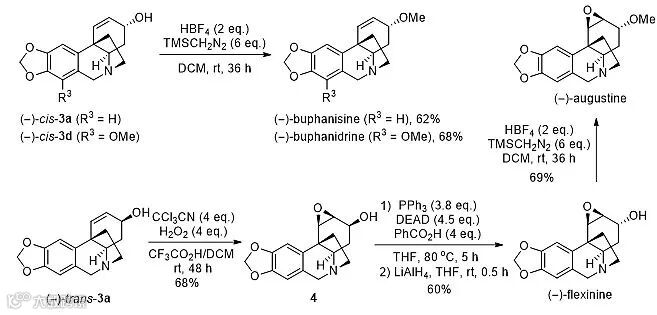 通过在3-位羟基上引入甲基,将双键环氧化等转化还可以合成得到文殊兰型生物碱(-)-buphanisine、(-)-buphanidrine、(-)-flexinine和(-)-augustine(图4)。