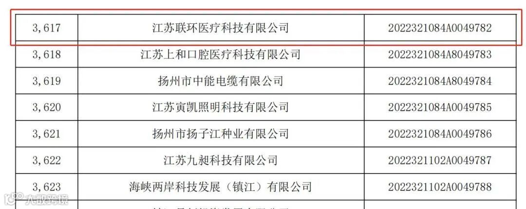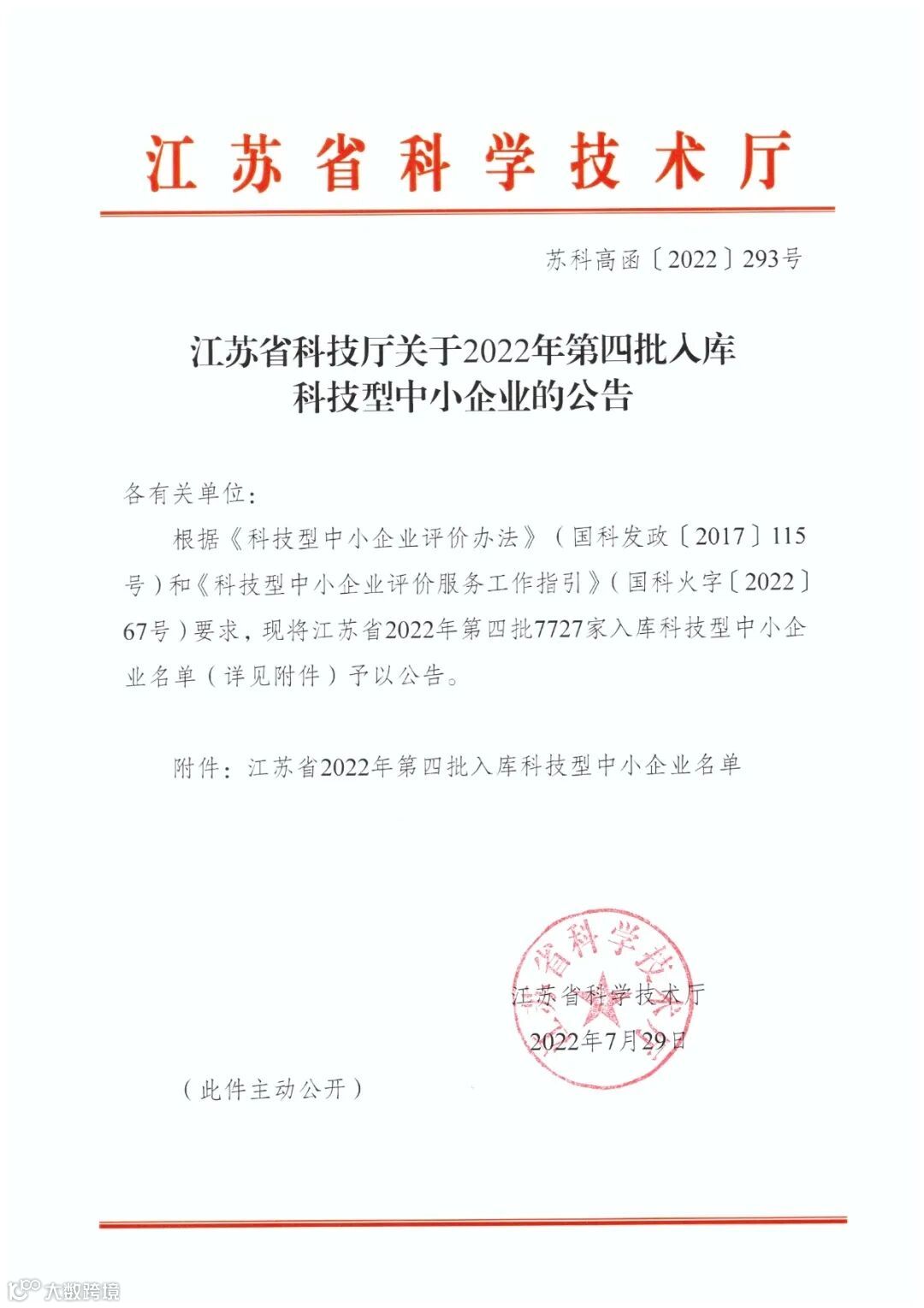 7月29日,江苏省科学教育厅公布了“江苏省2022年第四入库科技型中小企业”的名单,江苏联环医疗科技有限公司成功入选。