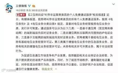 不过工信部此前刚表示,鼓励相关企业持证合法经营,为用户提供更好的语音声音和服务。当时有分析人士称,工信部这一表态也可视作对相关传言的辟谣,目前多数主流通信软件都是合法持证企业。
