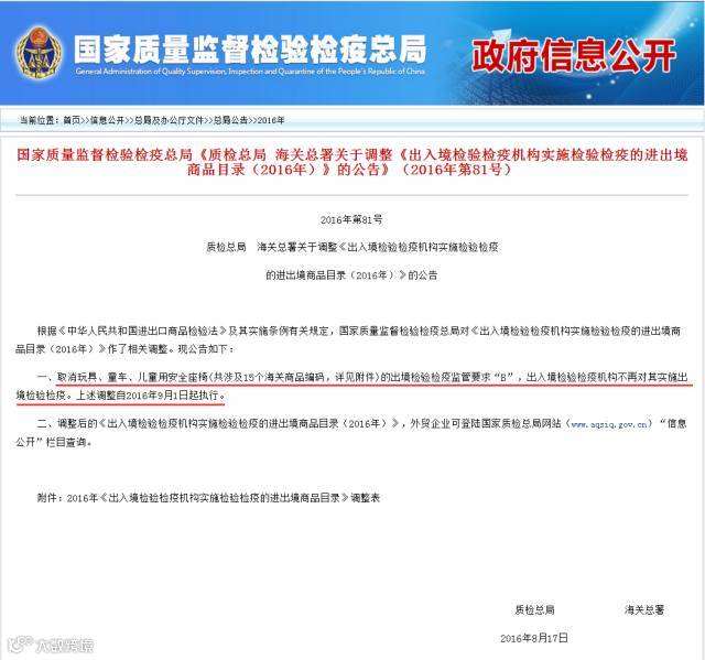国家质检总局于近日发布最新公告,将于2016年9月1日起,取消玩具、童车、儿童用安全座椅(共涉及15个海关商品编码,详见附件)的出境检验检疫监管要求“B”,出入境检验检疫机构不再对其实施出境检验检疫。