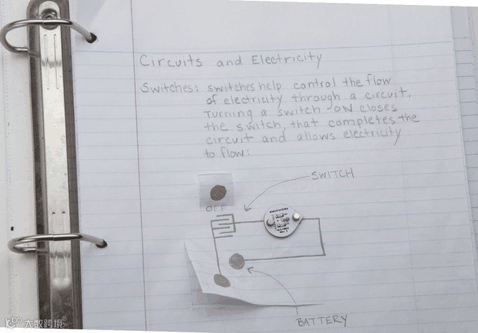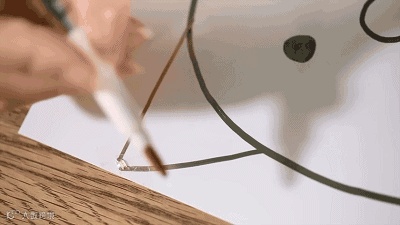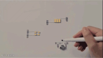 马克笔的墨水中不仅含有碳素墨水还特别添加了银纳米粒子,以增强掉电性能,所以画出来的每一个线条就像电线一样一样了。把电池与 LED 灯链接起来,就点亮了。。。