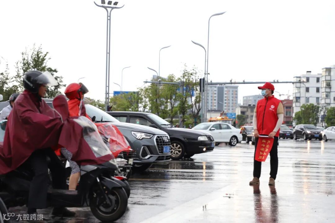“你好,请把口罩戴好!”“你好,你的头盔呢,有头盔的请佩戴好头盔!”“慢一点慢一点!红灯请在停车线内等候。”……9月13日下午,在渡江南路与江阳东路路口的交通岗点,联环志愿者夏枫站在雨中疏导交通,耐心劝导过往的行人和非机动车辆遵守交通规则。
