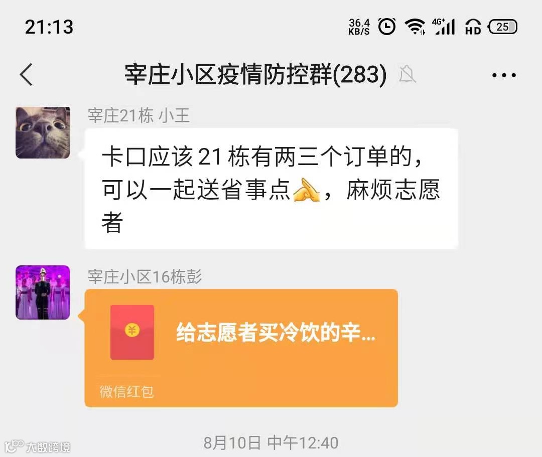 志愿者们的付出,居民看在眼里,记在心里,不少人在“宰庄小区疫情防控群”里给志愿者发红包,但志愿者们都一一婉拒了。谈旭说道,“作为年轻党员,保障群众生活是我们的使命,不需言谢。更何况,我们也感受到大家的关爱,这已经是最好的回馈了。”
