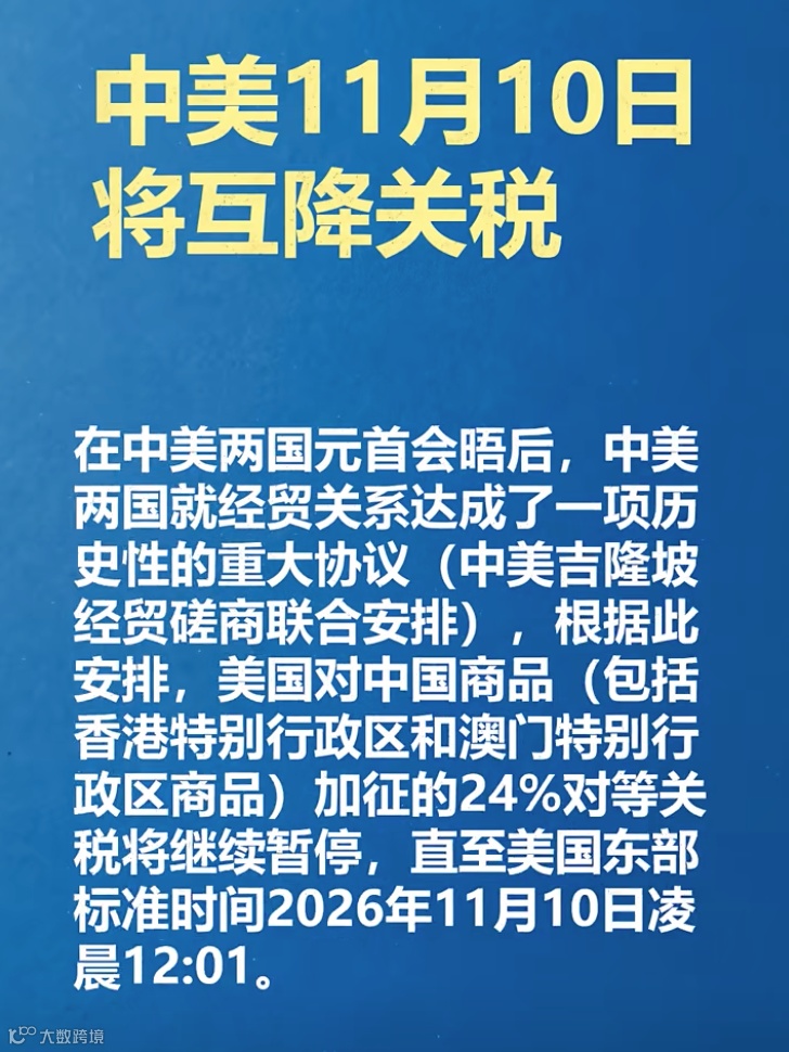 美国暂停对中国进口商品加征更高对等关税的政策,原本暂停期至2025年11月10日结束,现延长至2026年11月10日。在延长暂停期间,现行的10%对等关税将继续有效。