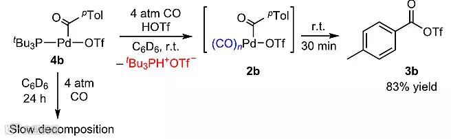 与他们以往报道不同的是,使用Pd2dba3-膦配体(如tBu3P)催化条件时反应效果并不理想,通过实验他们证明原因在于插羰中间体tBu3PPd(COAr)OTf的还原消除反应需要CO和HOTf的共同参与。