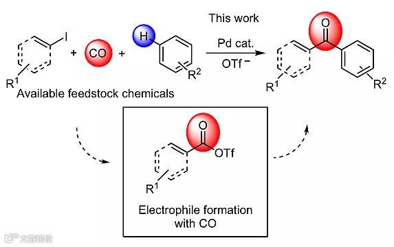 基于此,最近Bruce Arndtsen教授团队使用CO为羰基源,通过钯催化的插羰反应原位生成了ArCOOTf,并进一步与芳香烃发生酰基化反应生成芳基酮化合物。相关工作发表在Nature Chemistry 杂志上。