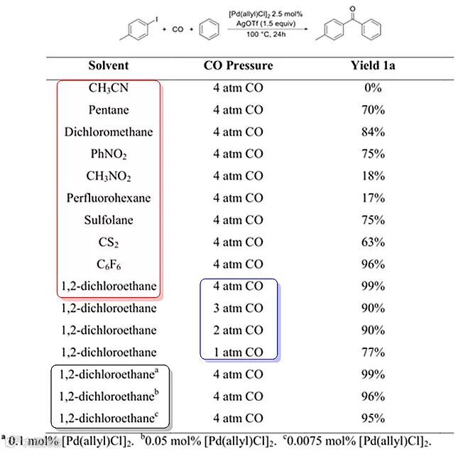 图9. 溶剂筛选及CO和催化剂用量的考察。图片来源:Nat. Chem.